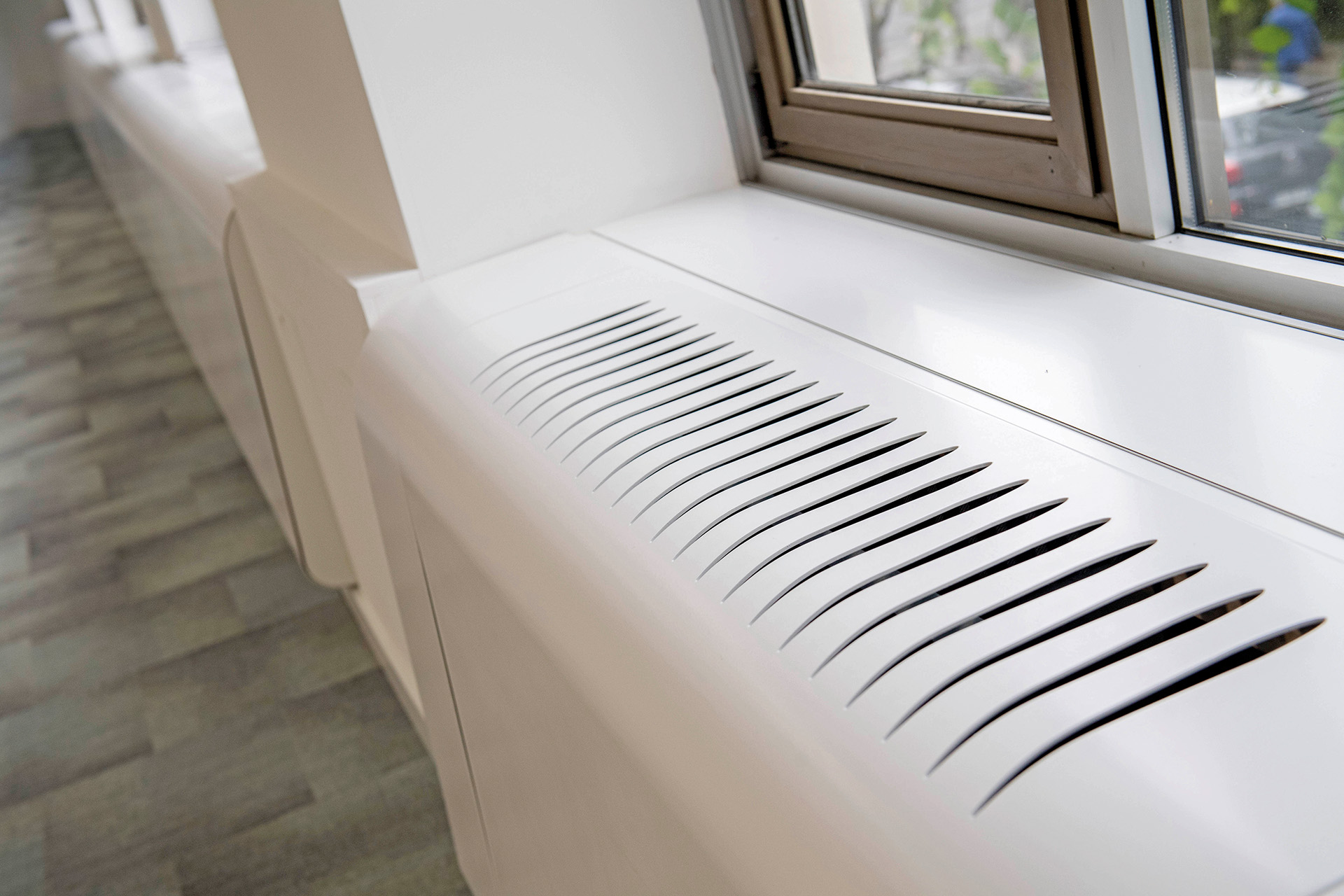 Afin de conserver le système de climatisation en allège existant, des caches-ventilateurs sur mesure ont été conçus, inspirés du travail de Lucio Fontana et de son concept de Concetto Spaziale. En incisant la toile, Fontana ne la détruisait pas : il révélait un espace nouveau, une profondeur insoupçonnée au-delà de la surface. Cette démarche, entre rupture et révélation, a guidé la conception : les ouvertures pratiquées dans la matière ne sont pas de simples perforations techniques, mais des gestes graphiques transformant la contrainte en motif artistique.