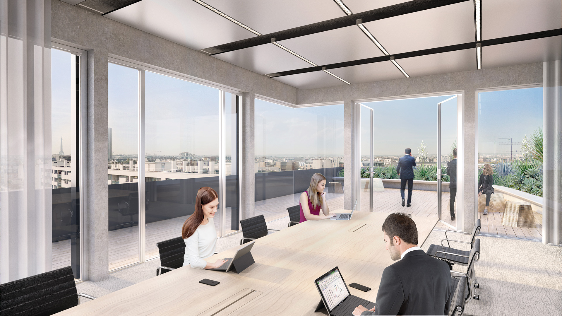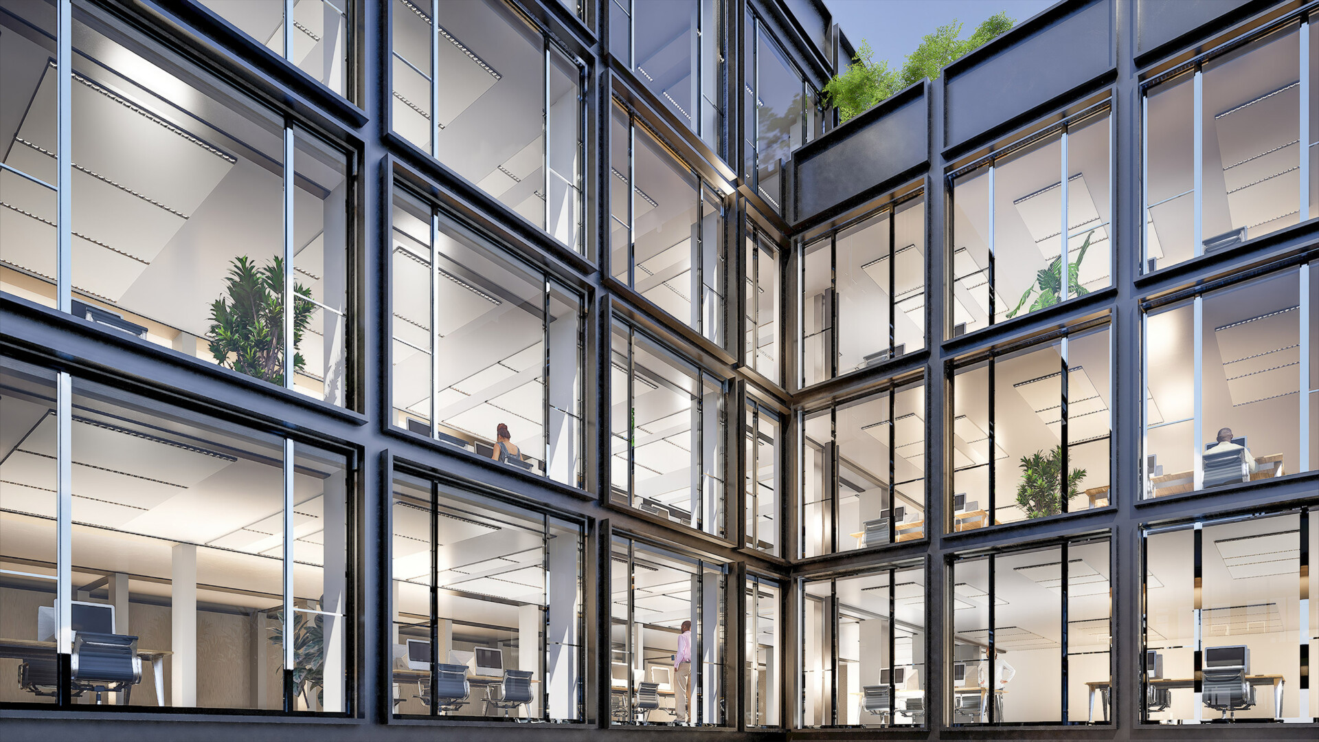 La trame carrée des façades, composée d’un grand vitrage fixe et d’un ouvrant toute hauteur, confère aux bureaux un caractère haut de gamme.