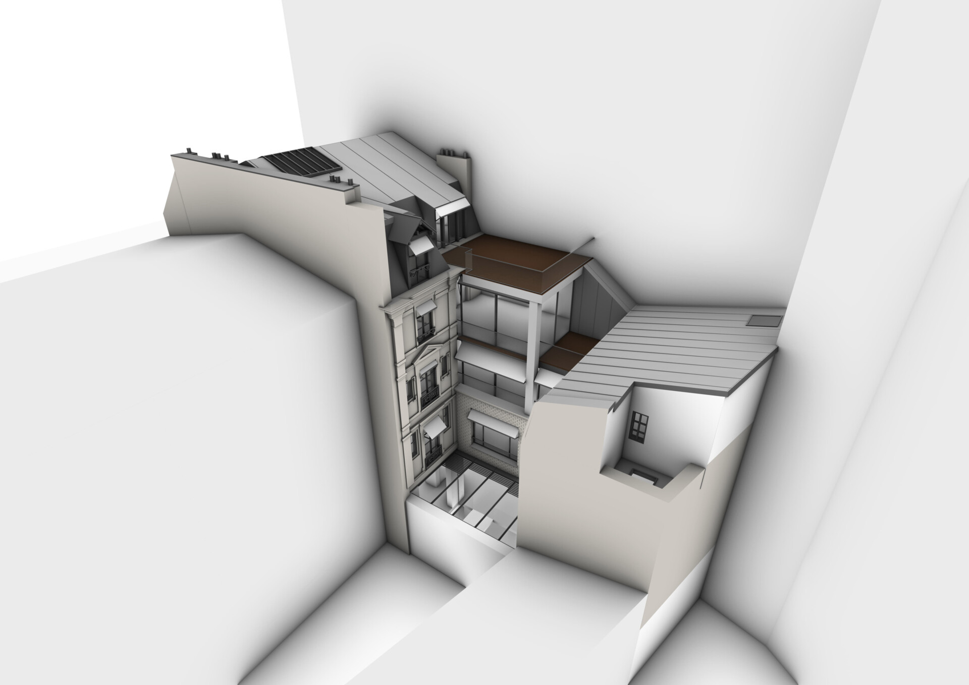 Ce projet, dans la lignée de l’opération du 95 Pereire, concerne la transformation d’un petit hôtel particulier à usage de bureaux. Bien qu’ayant déjà connu plusieurs rénovations et extensions, le bâtiment conservait encore des caractéristiques historiques précieuses : sa composition générale et la décoration de certaines pièces.