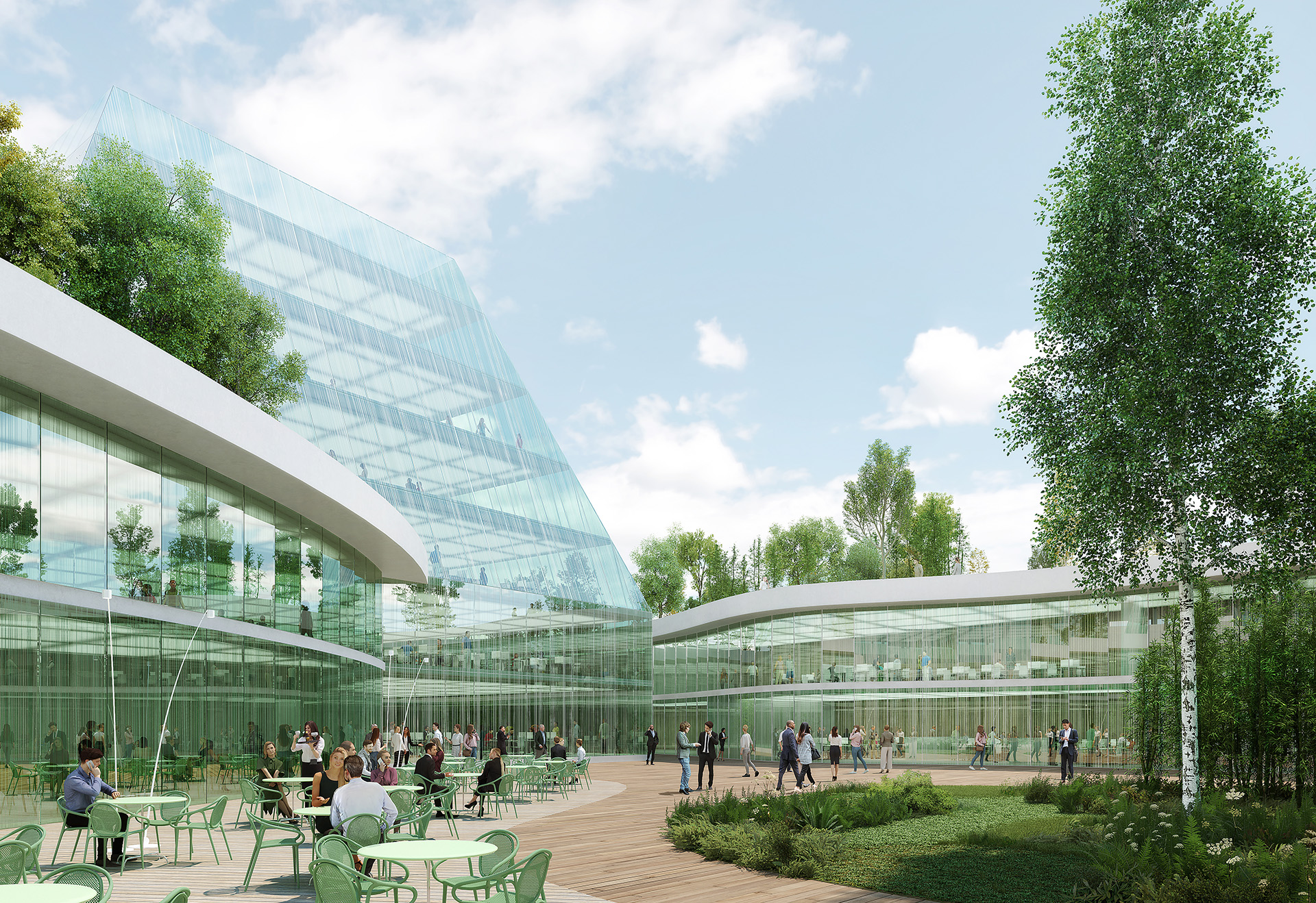 Un parking aérien formait un écran antibruit du côté de l’autoroute, protégeant le cœur du site. Une nappe horizontale de bureaux abritait les espaces de services et un business center, tandis que des îlots de bureaux en volumes pyramidaux semblaient jaillir du fond du terrain, créant un paysage architectural singulier.