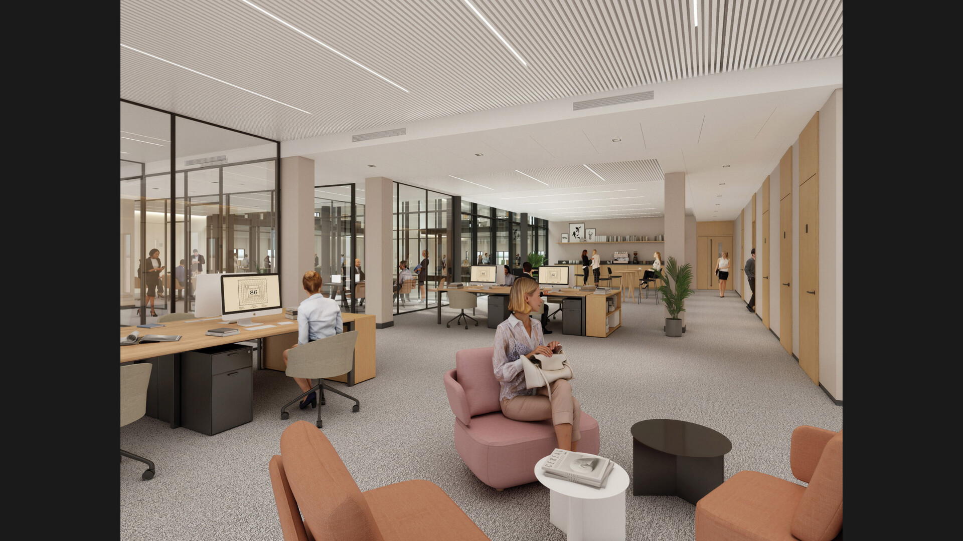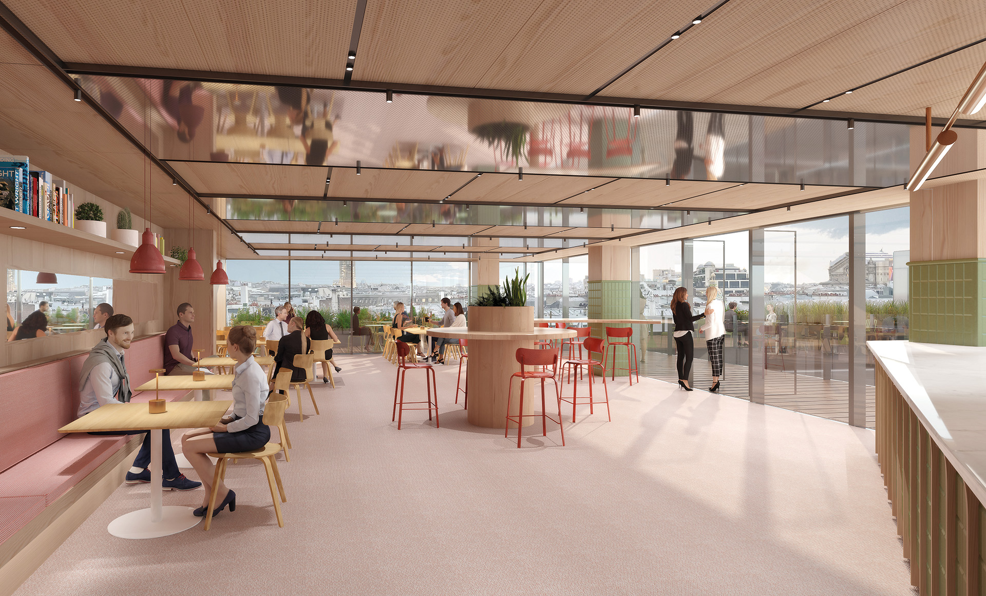 Le projet intègre également la notion innovante de penthouse serviciel, véritable “couronne” programmatique de l’immeuble. Situé en toiture, cet espace regroupe des fonctions partagées à forte valeur ajoutée – salles de réunion premium, salons de réception, espaces de convivialité ou zones de travail collaboratif – offrant aux utilisateurs une expérience comparable à celle d’un hôtel haut de gamme. Placé au sommet du bâtiment, il bénéficie de lumières et vues exceptionnelles, renforçant le caractère prestigieux de l’adresse. Cette approche, encore rare à Paris, illustre la volonté d’Archibuild de réinventer les usages tertiaires en associant confort, flexibilité et services premium.