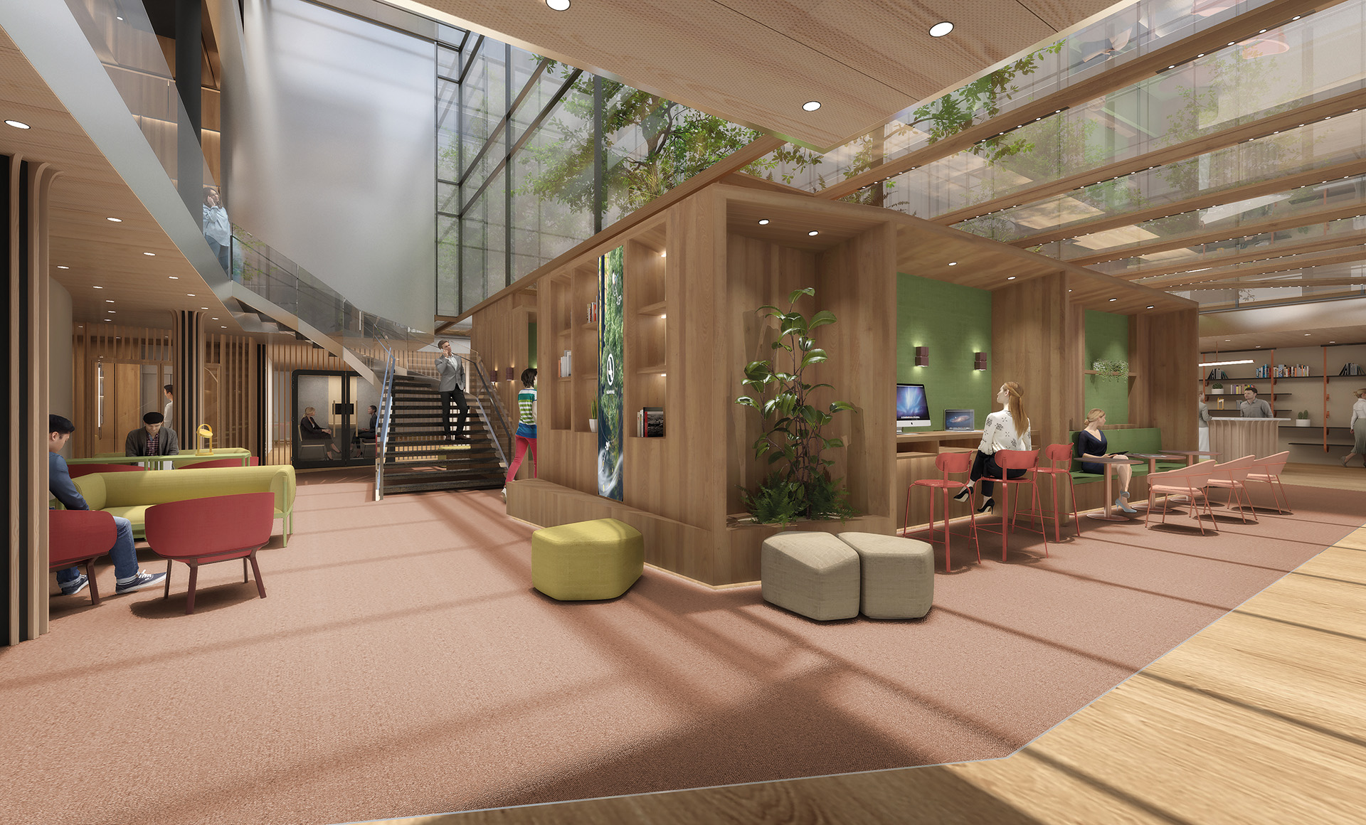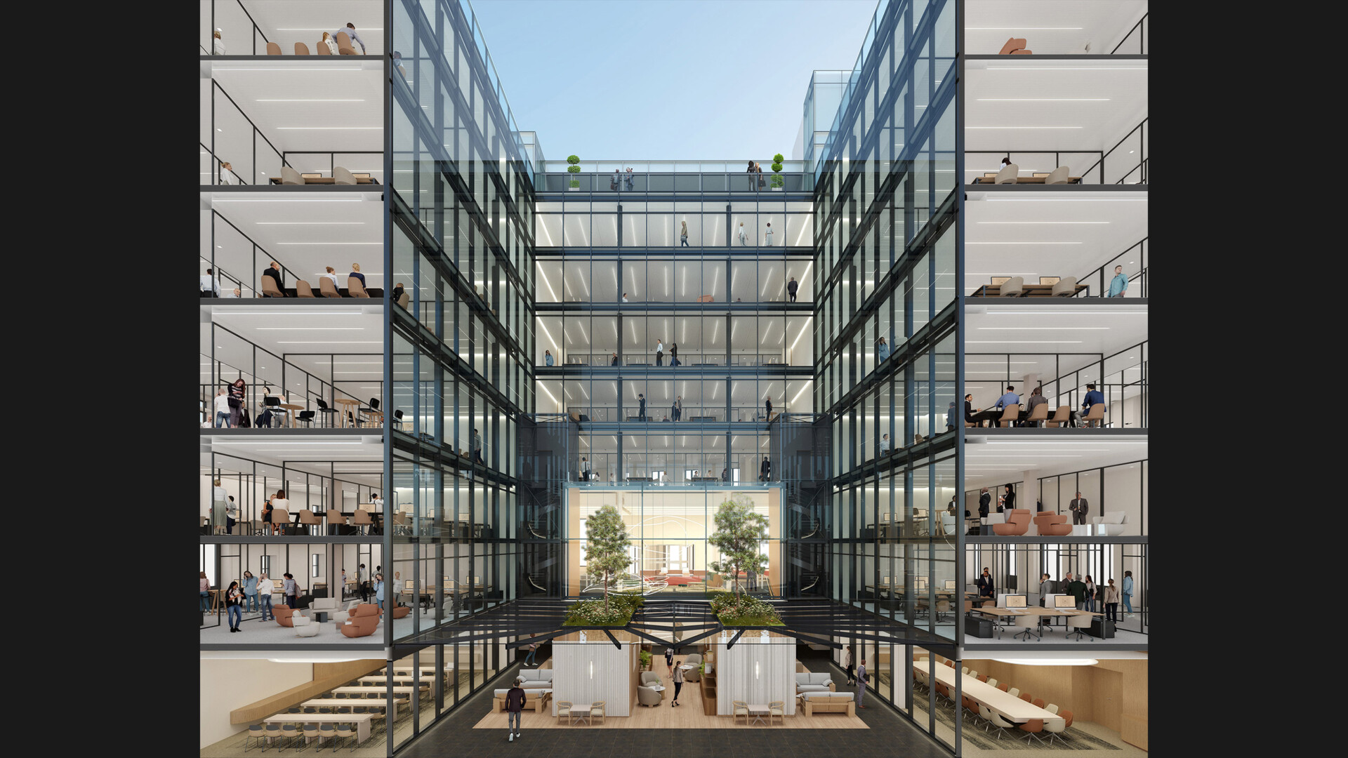 Le projet a consisté à restructurer le socle en duplex autour de l’auditorium et d’un ensemble de salles de réunion. Un escalier monumental, installé dans le hall sous une verrière triple hauteur, crée un accès généreux et lumineux. Les espaces techniques du premier sous-sol ont été reconvertis en lobby, cafétéria et salles de réunion, donnant naissance à un duplex serviciel baigné de lumière.