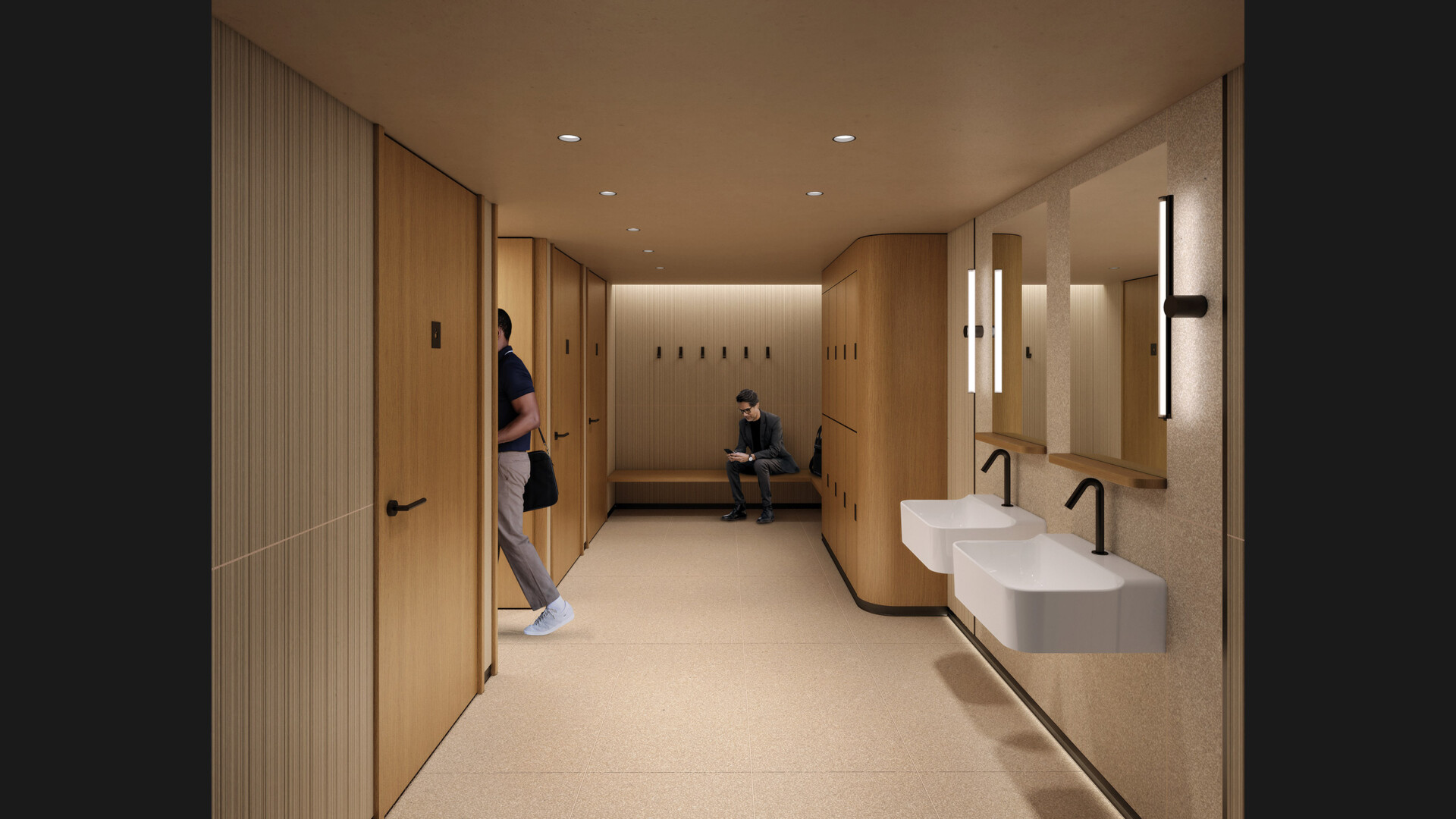 Le premier niveau de parking a été transformé en zone de mobilité douce, avec des vestiaires confortables pour les utilisateurs sportifs. Studio Archibuild a assuré l'architecture intérieure des espaces de bureaux et de la zone mobilité douce, tandis que Atelier Flow a pris en charge celle des espaces serviciels.