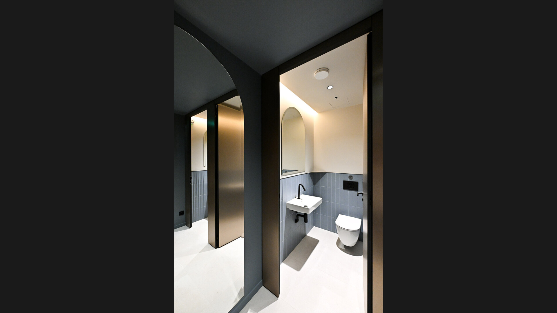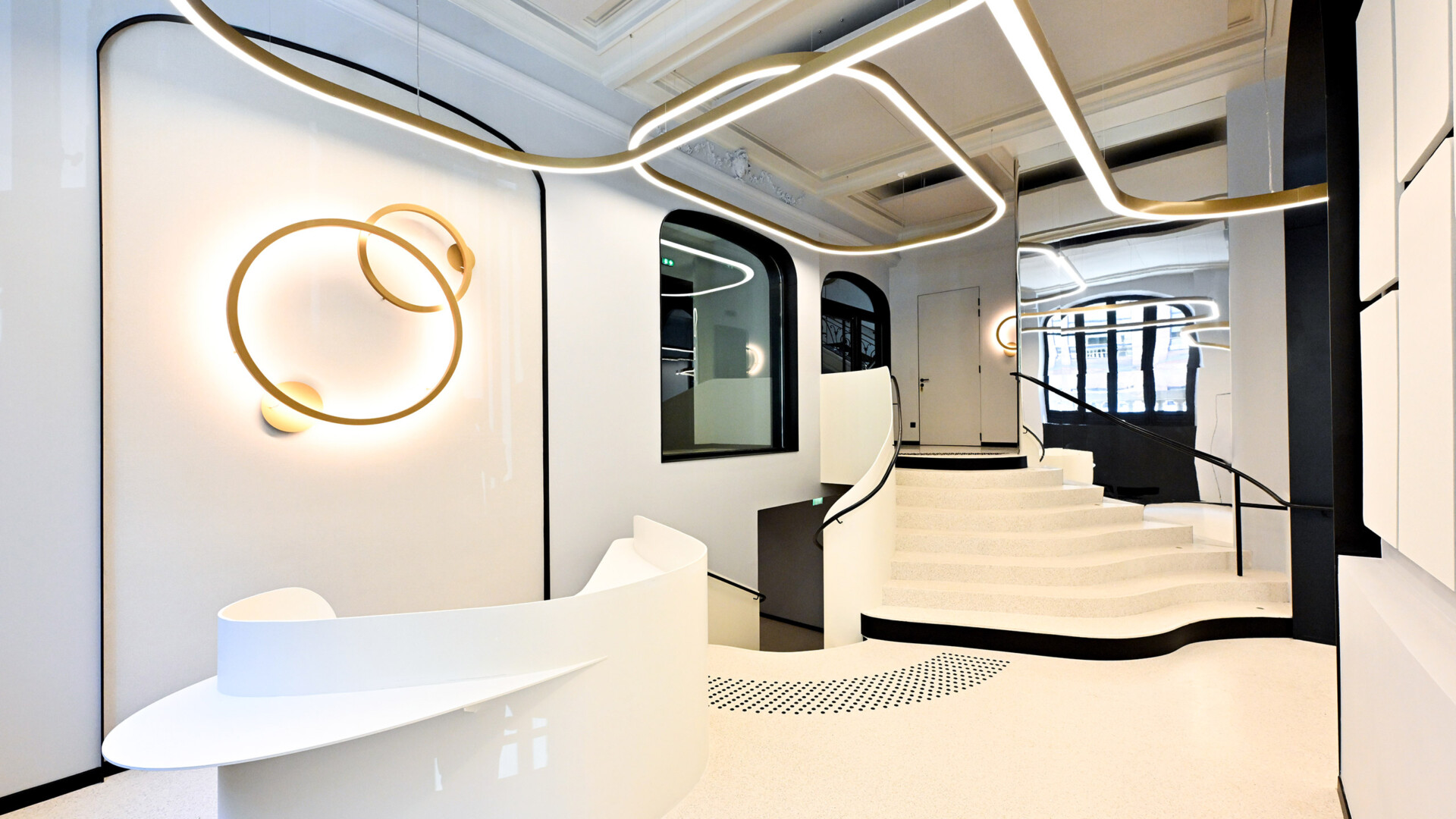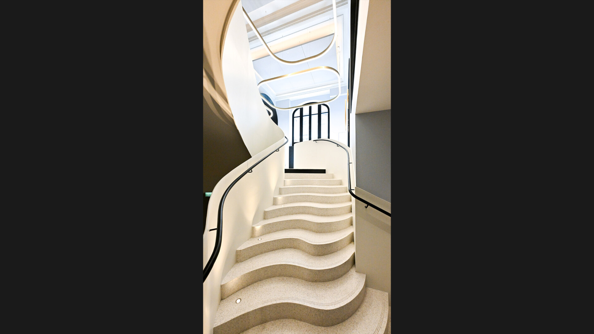 Le Studio Archibuild a imaginé un hall d’accueil alliant chaleur, élégance et respect du patrimoine. Les miroirs rétroéclairés, les suspensions en laiton, le sol en terrazzo sur mesure et les teintes pastel dialoguent avec les moulures et les arches d’origine. L’escalier, redessiné comme un ruban fluide, s’enroule autour de la banque d’accueil, unifiant les volumes et magnifiant la verticalité de l’espace. Chaque détail a été pensé pour conjuguer confort, lumière et acoustique, tout en sublimant la richesse historique du lieu.