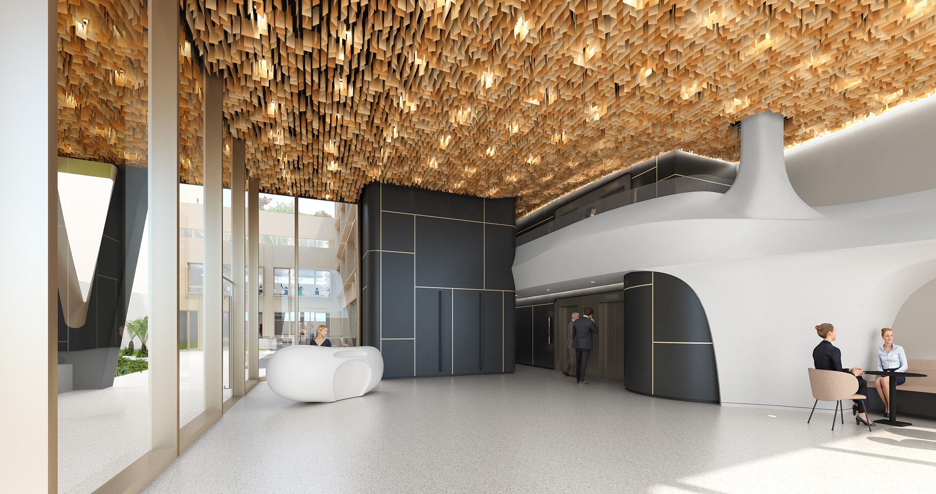 Le projet s’attache à sublimer l’identité de l’immeuble tout en en renouvelant les usages. L’élévation du bâtiment sur pilotis libère la vue sur le cœur d’îlot et crée un imposant hall d’entrée en double hauteur. Cette composition en V redéfinit la silhouette de l’édifice et en fait un repère architectural sur l’avenue.