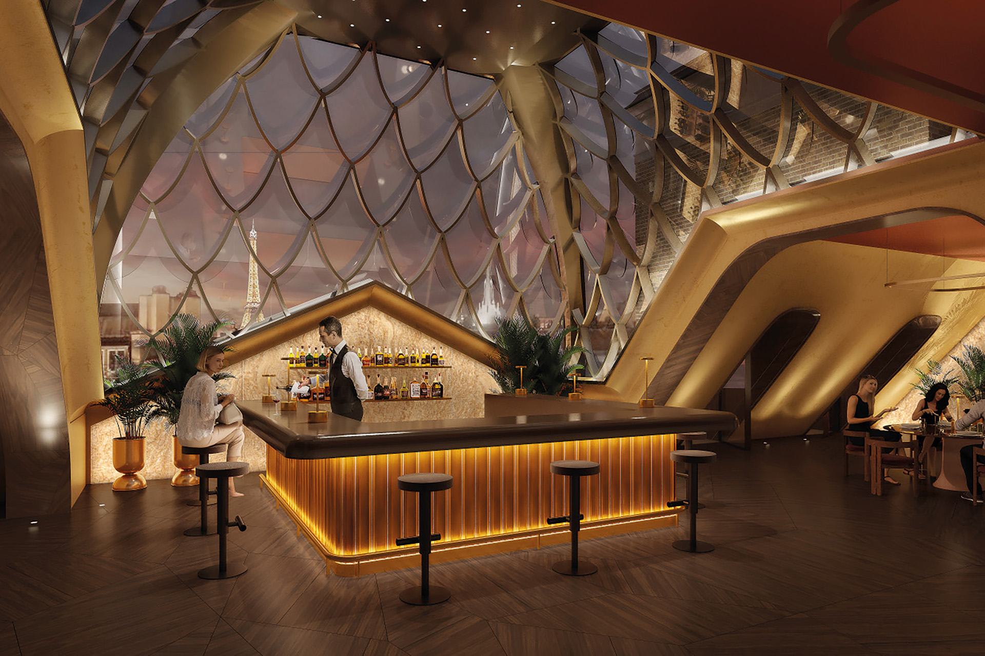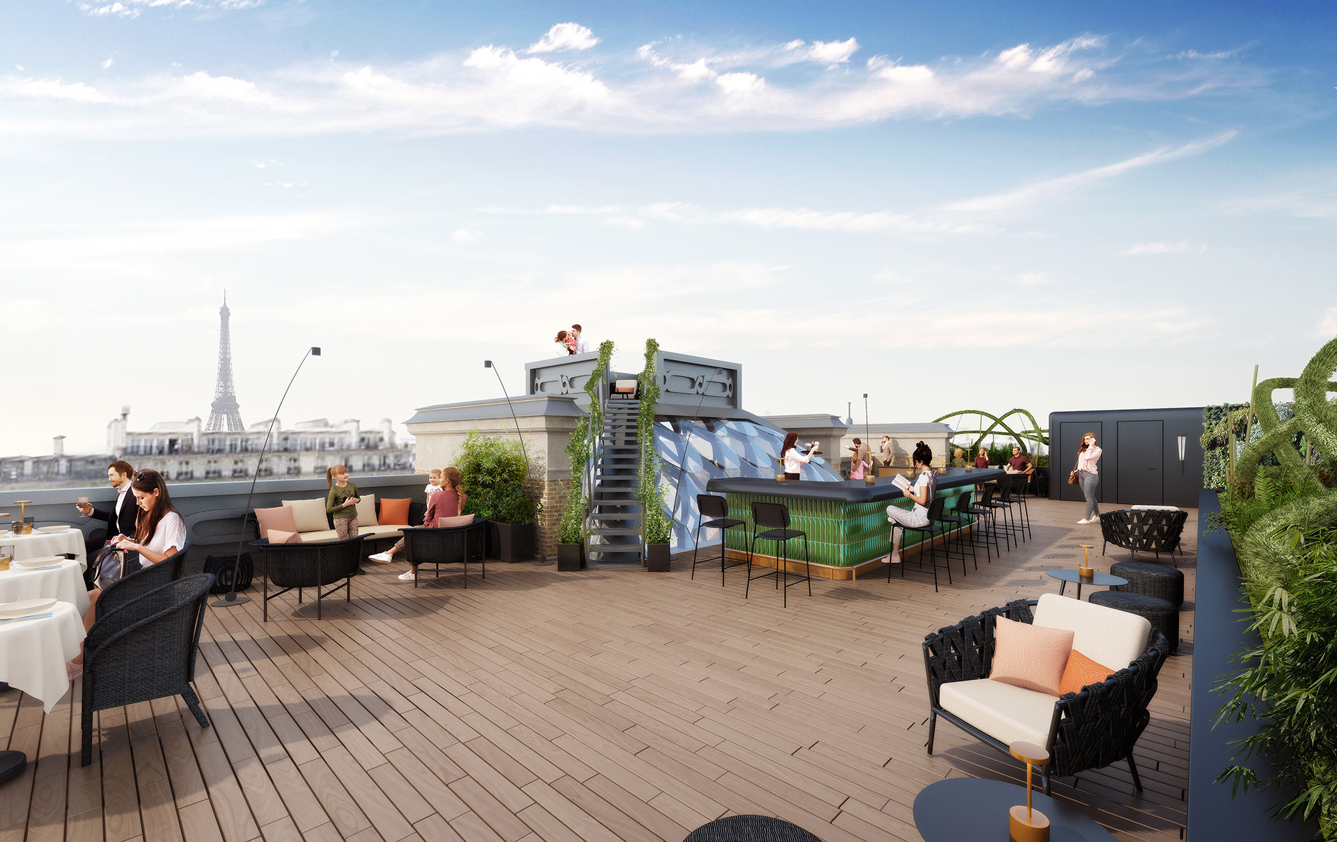 Le lobby du premier étage s’organise autour d’une cour intérieure coiffée d’une verrière à écailles, un ouvrage singulier signé François-Xavier Barade. Le restaurant en toiture devait initialement être abrité par un dôme à écailles, une option encore soumise à l’approbation de l’ABF.