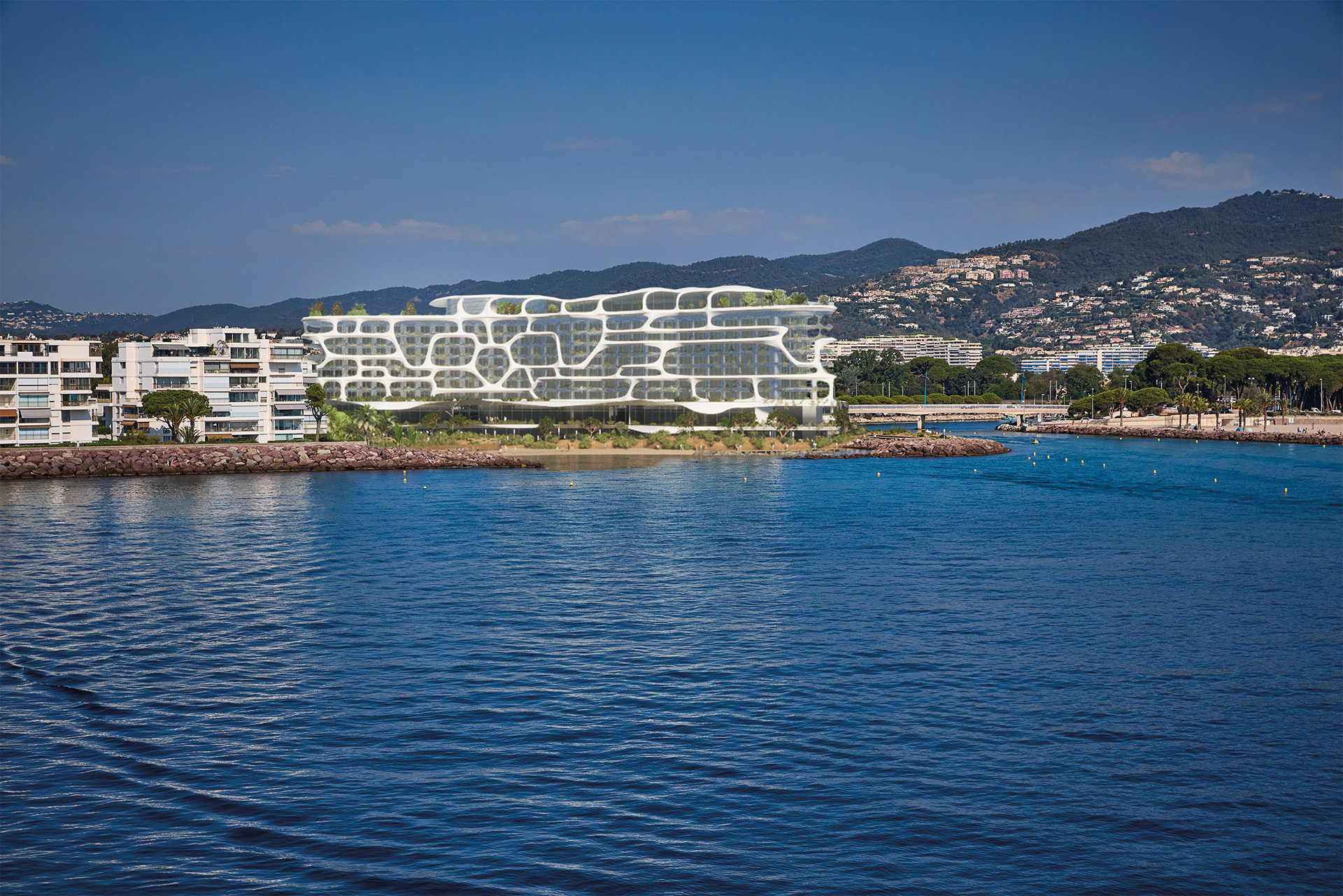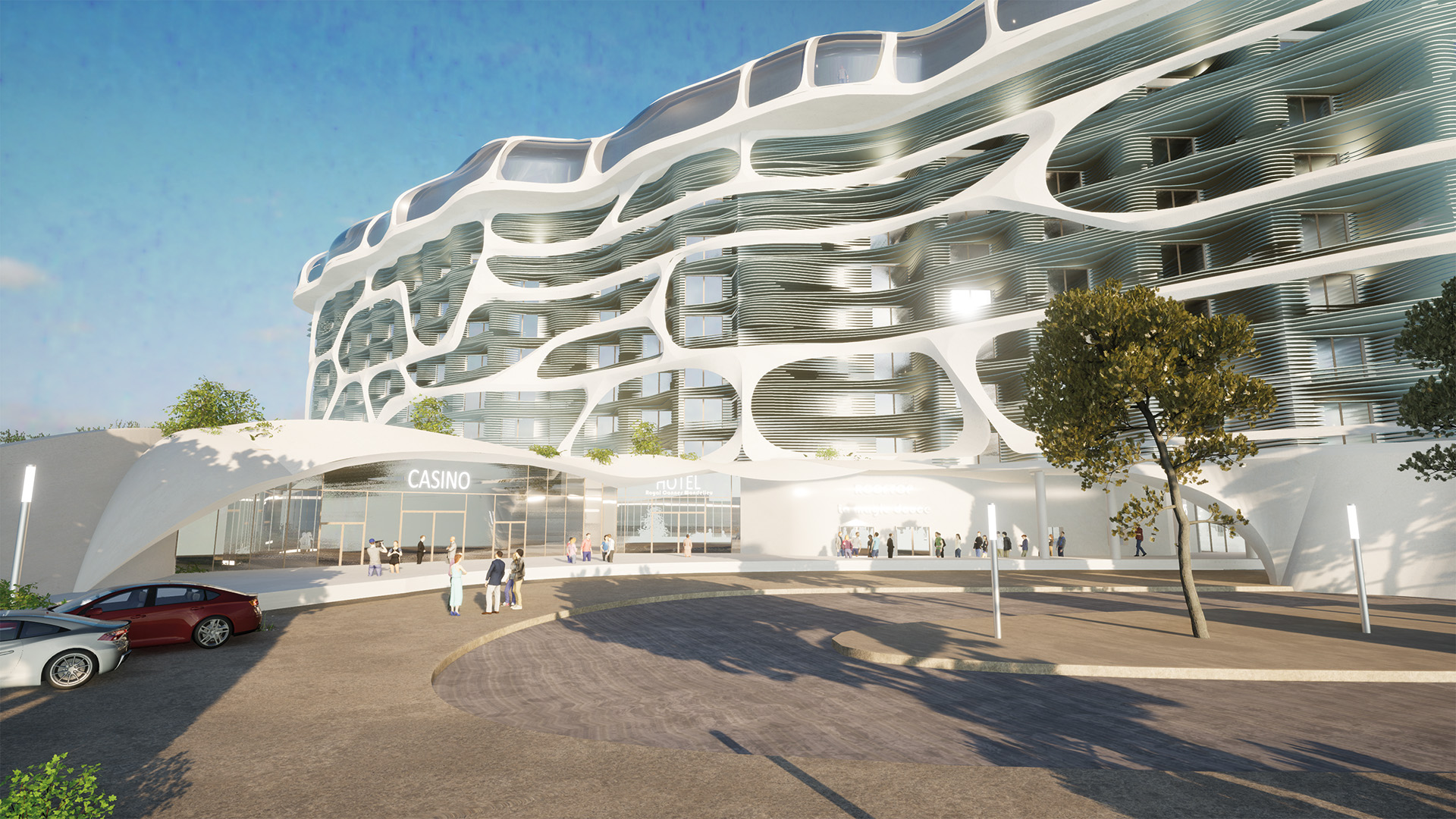 Les façades et volumes du projet traduisent chacun une facette de l’univers marin. L’exosquelette blanc symbolise l’écume, comme si une vague gigantesque venait se briser sur l’édifice existant. Les lamelles qui habillent les loggias, évoquent quant à elles la risée, cette trace subtile laissée par le vent à la surface de l’eau, avec une teinte travaillée pour refléter les nuances qu’apportent le vent de la mer. Le roof top est couvert d’un toit courbe qui reprend le mouvement de la houle et s’inscrit dans le prolongement des courbures des montagnes en arrière-plan. Enfin, les façades du socle sont animées par de grandes ombrelles en toile tendue, dessinant les profils ondoyants des vagues sur la place.