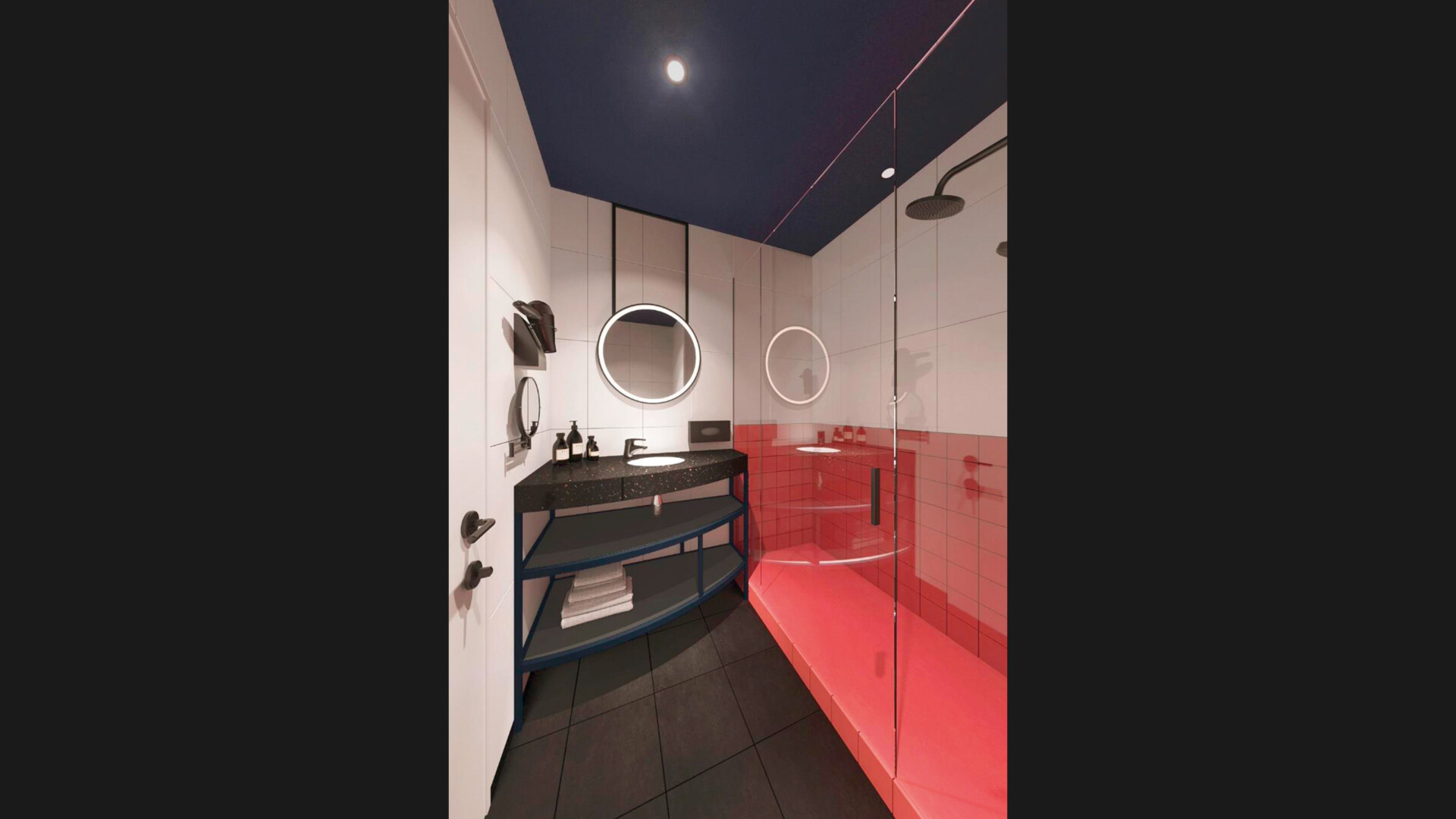 L’inspiration du projet s’est nourrie de l’urbanisme de la ville, marqué par un quadrillage rigoureux : un clin d’œil à Mondrian, transformé ici en storytelling artistique et contemporain. Cette trame a servi de fil conducteur pour moderniser les espaces, tout en respectant un budget contraint. L’approche fut volontairement maline : habillage de l’existant (enduit coloré sur faïence pour les salles de bains, revalorisation des matériaux), afin d’offrir un résultat impactant sans recours au luxe ostentatoire.