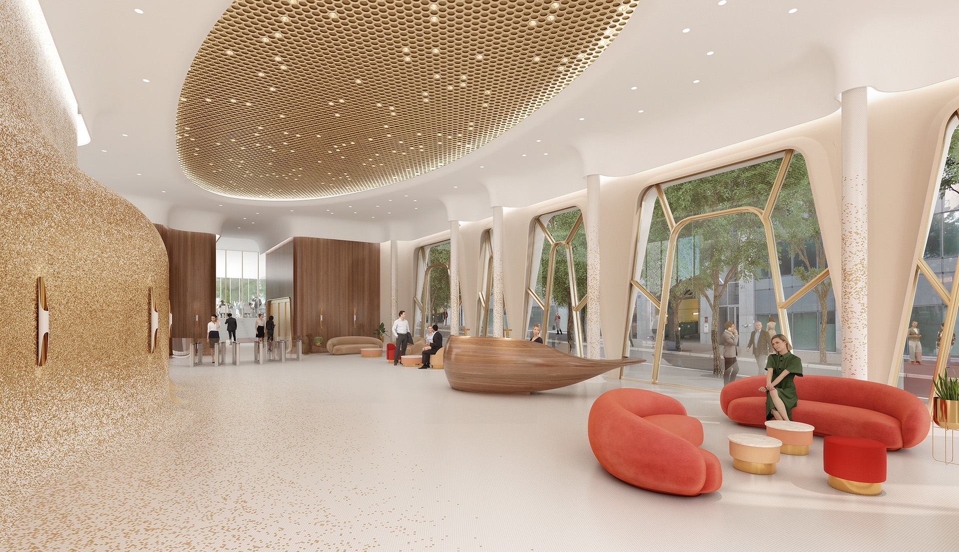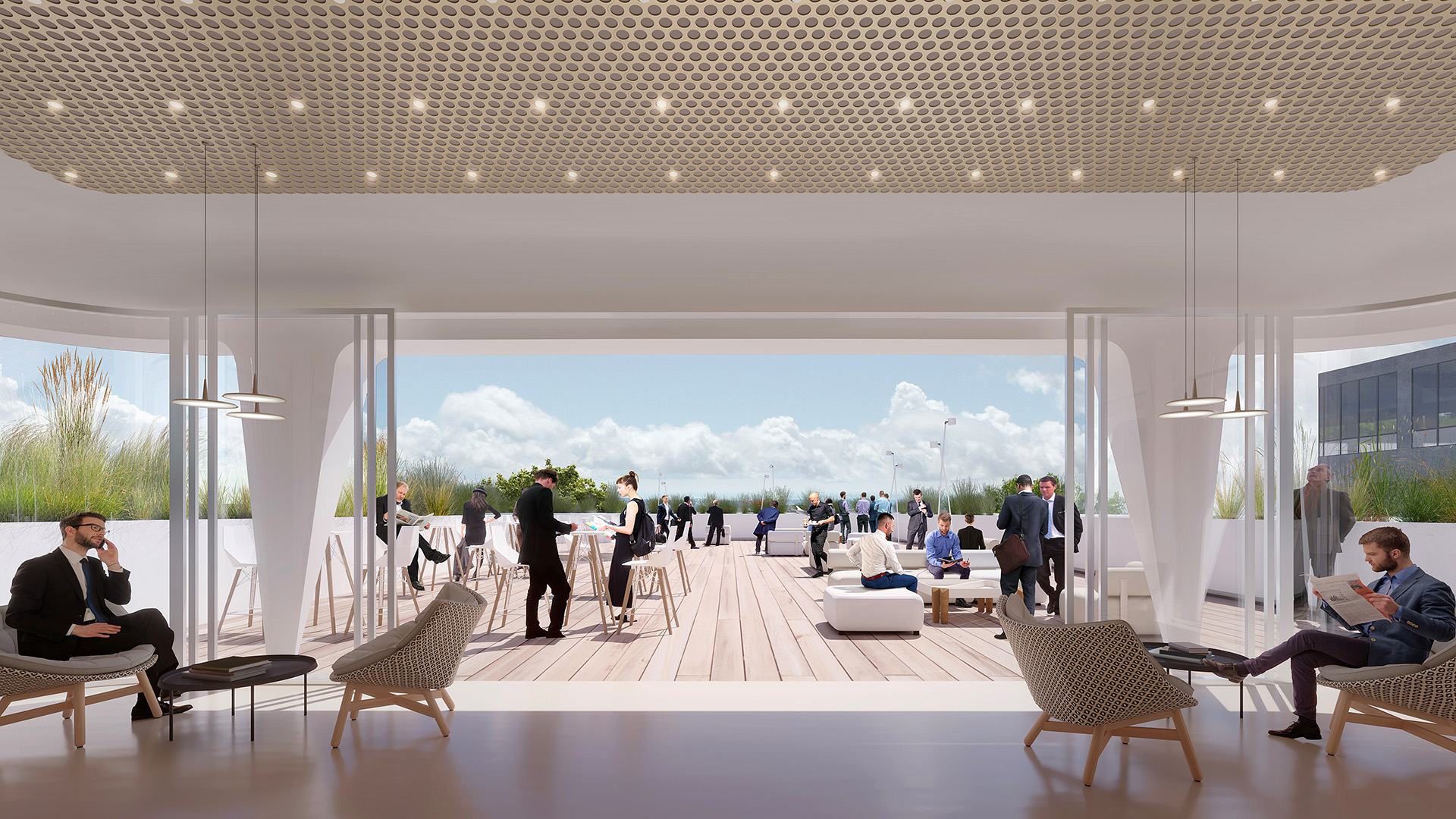 La nouvelle enveloppe extérieure affirme une écriture architecturale contemporaine, à la fois puissante et douce, qui donne au bâtiment une identité forte et reconnaissable. La façade, alternant surfaces vitrées et volumes pleins, s’organise autour d’un socle monumental de deux étages, tandis que les niveaux supérieurs sont animés par des balcons filants qui allègent la composition et apportent une grande fluidité visuelle.