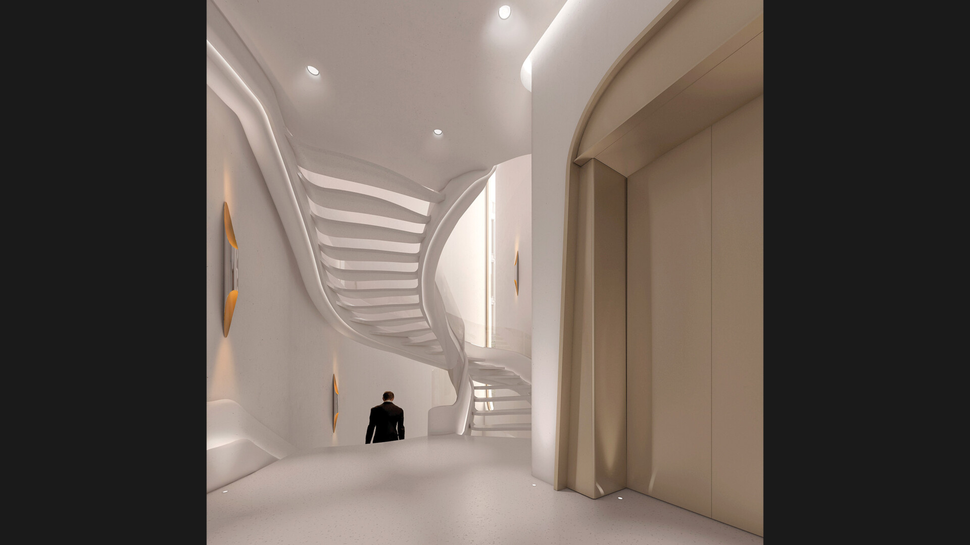 L’escalier, conçu comme une véritable sculpture architecturale, s’organisait autour d’un limon central porteur et de contremarches évidées, flottant dans l’espace telle une hélice d’ADN. Cette organisation spatiale, qui remet à l’honneur la monumentalité des cages d’escalier disparue depuis l’avènement de l’ascenseur, favorise également l’usage de l’escalier au quotidien, contribuant au bien-être des occupants et aux économies d’exploitation.