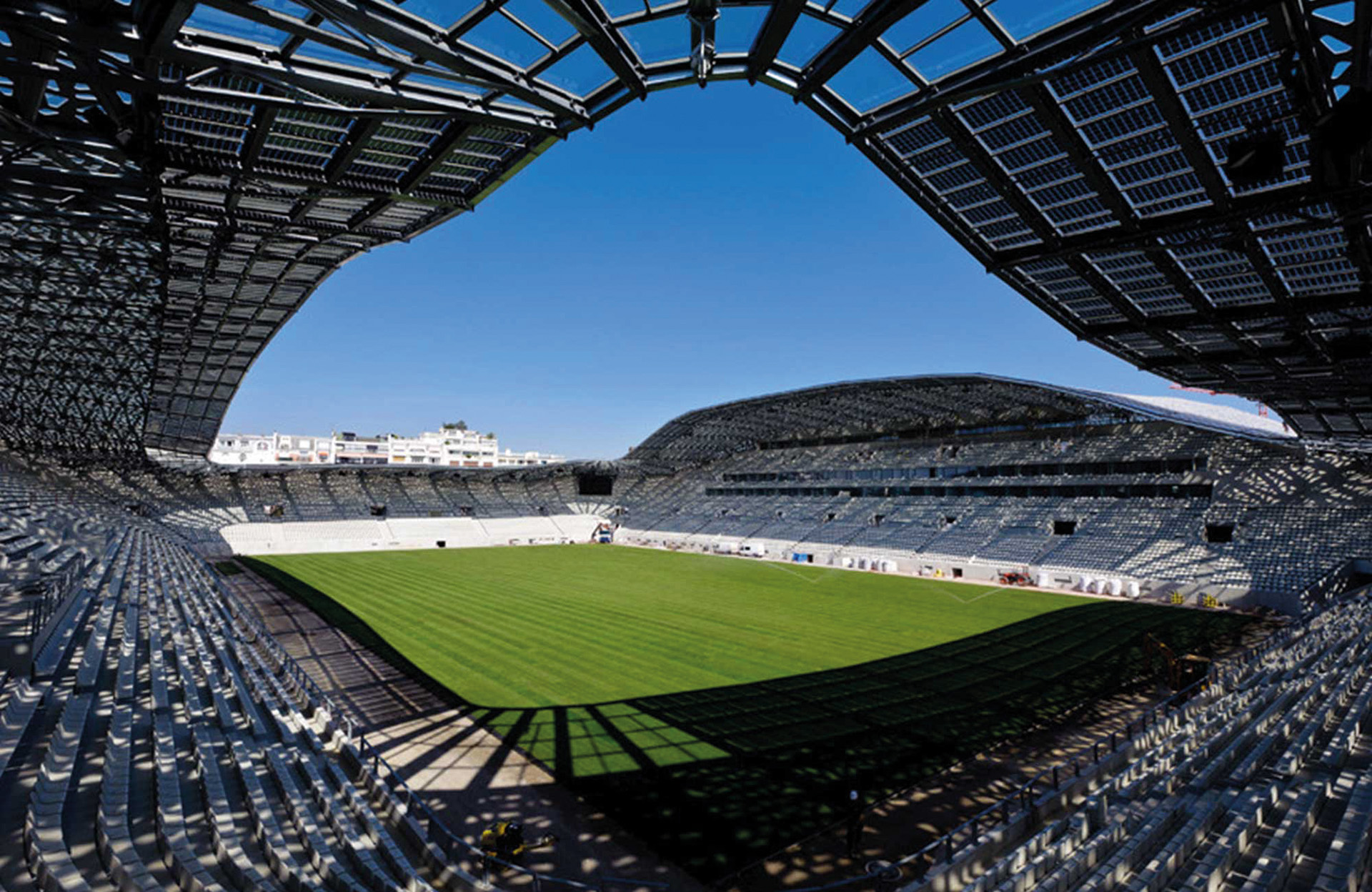 Conçu par Rudy Ricciotti, le Stade Jean Bouin se distingue par sa façade et sa couverture en panneaux de BFUP (béton fibré ultra-performant) formant un maillage tridimensionnel d’une grande finesse.