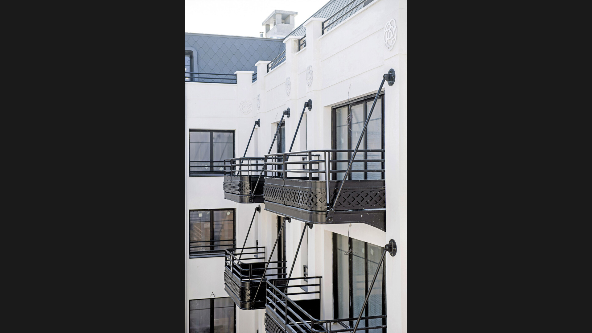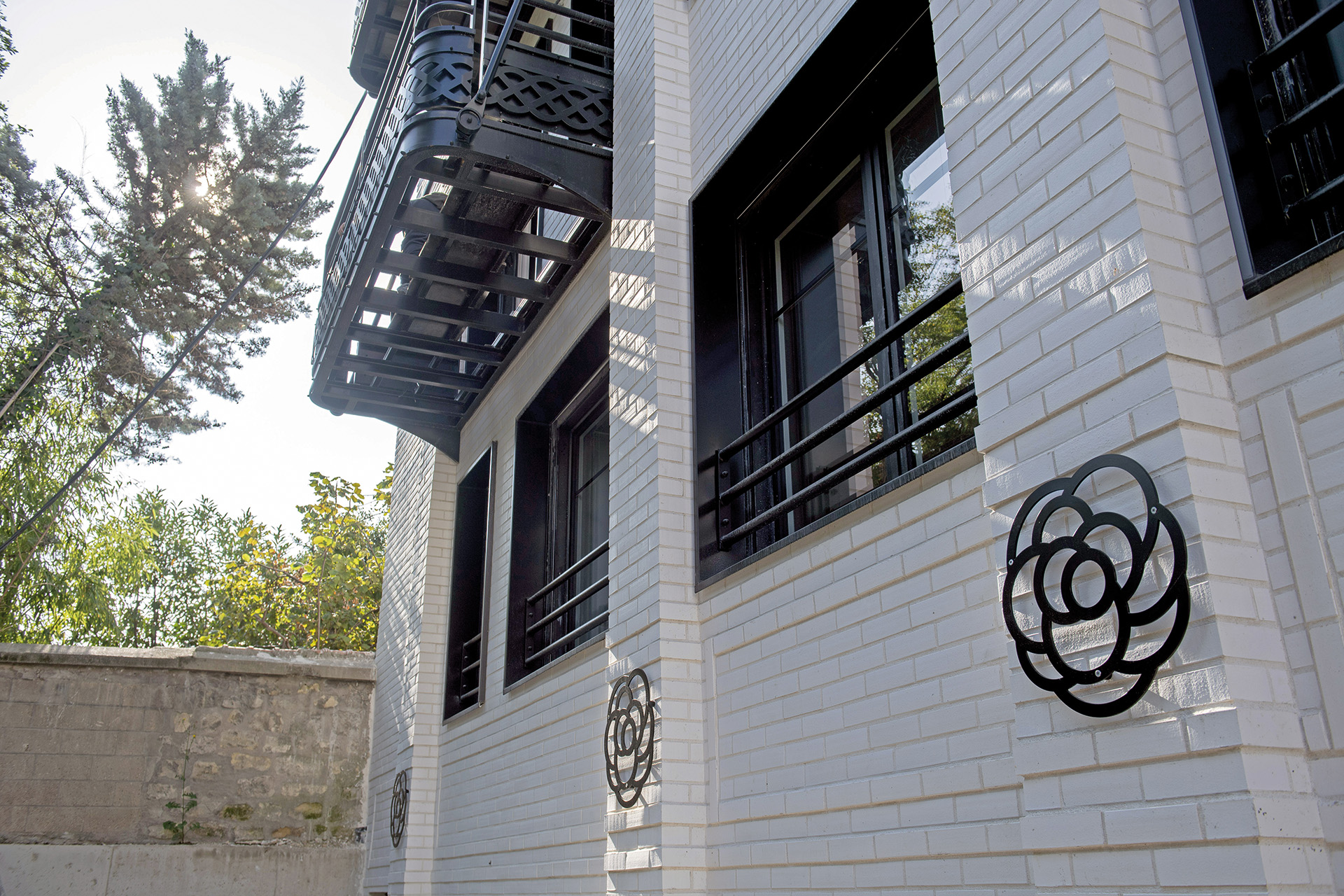 Le travail s’est concentré sur la composition des façades : loggias, balcons, pilastres et corniches, calepinage minutieux des briques et ferronneries traditionnelles. La grille monumentale et les modénatures en acier noir, dessinées par Sophie de Courcy (Studio Archibuild), rendent quant à elles hommage à un motif emblématique de Chanel, établissant un lien subtil entre l’histoire du lieu et son nouvel usage.